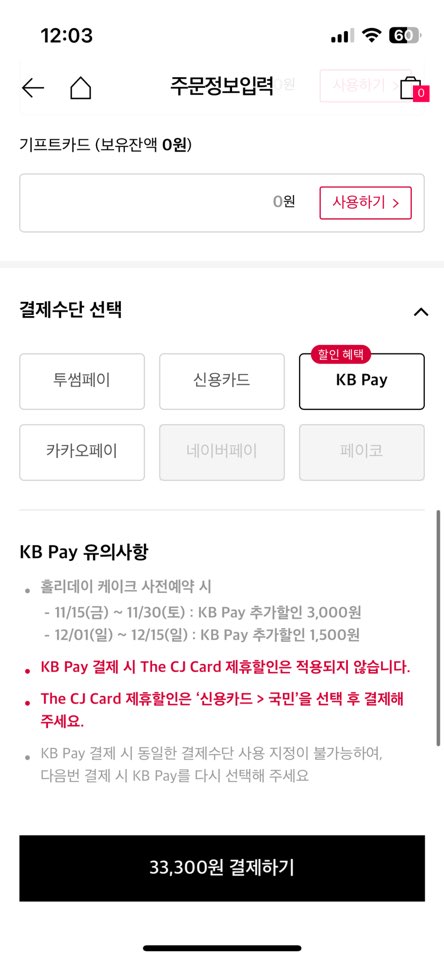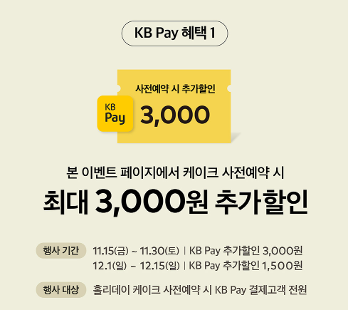 KB Pay 추가 할인은 1월 15일~11월 30일까지는 3,000원 할인, 12월 1일~12월 15일까지는 1,500원이 할인된다고 하네요.