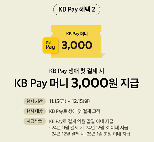 또한, KB Pay로 결제시 최대 3천원 추가할인 외에 KB Pay로 생애 첫 결제시에는 머니로 3천원을 지급해준다고하니 꼭 KB Pay로 결제하셔서 최대 할인 혜택 받아보세요😊 ( KB Pay 추가 혜택은 결제 단계에서 KB Pay 결제 시 확인 가능 )