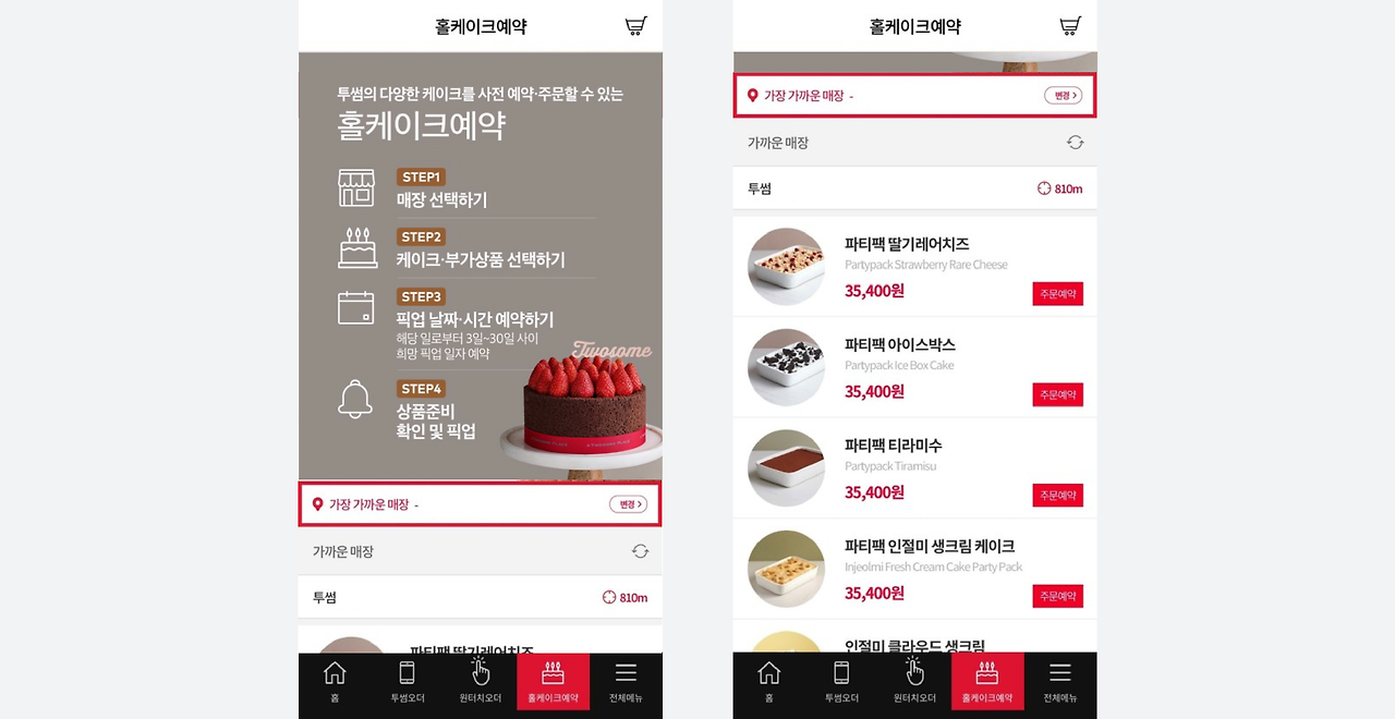 위에 '투썸하트 앱' 을 다운받으셨다면 아래의 그림대로 따라하시면 바로 예약할 수 있습니다.