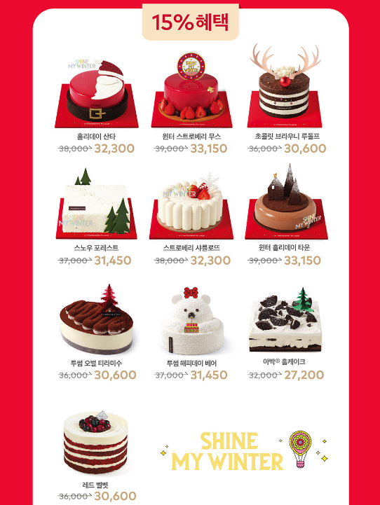 특히 크리스마트 케이크 예약이 만료되는 12월 15일 까지 예약을 하면 최대 24%의 할인 혜택이 적용되니 꼭 예약을 해서 할인 혜택을 적용받으시기 바랍니다.
